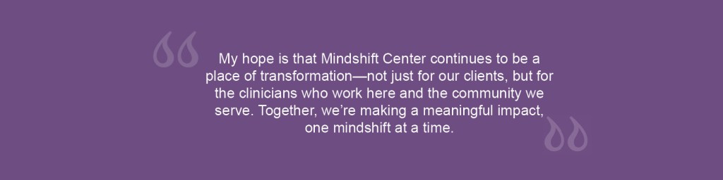 “The name Mindshift Center reflects something I deeply believe: the way we think—and how we think about our experiences—shapes how we respond to life’s challenges. A shift in mindset can be the beginning of real, lasting change. Whether someone is navigating trauma, anxiety, relationship struggles, or life transitions, we aim to help them reframe, rediscover, and reclaim their strength.”
